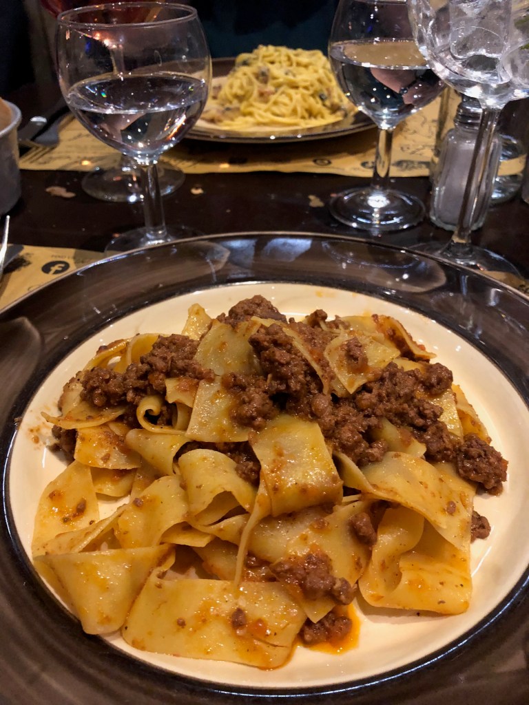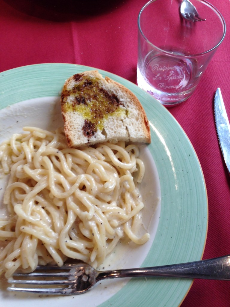 As I usually base my Tuscany trips in Florence, one trip we were going back and forth from the train station nonstop and kept passing this restaurant and every time it smelled delicious enough to make us want to try it. “La Spada” means “the sword” in Italian and it is a nod to the skewers that they roast most of their meats on at the restaurant. After I discovered the delicious cacio e pepe dish, I was amazed to find the pici senesi pepe e pecorino, which strangely sounded like cacio e pepe, but with a Tuscan twist (“senesi” meaning from Siena). I was so impressed and satisfied with my dish that a few nights later when I couldn’t find a restaurant with an appealing menu that evening, my parents and I went back to Ristorante la Spada and I enjoyed my dish once again. When I went back a few years later I didn’t see it on the menu, but when I asked nicely, they made it for me again! I just checked and it is back, so feel free to go and enjoy next time you are in Florence.