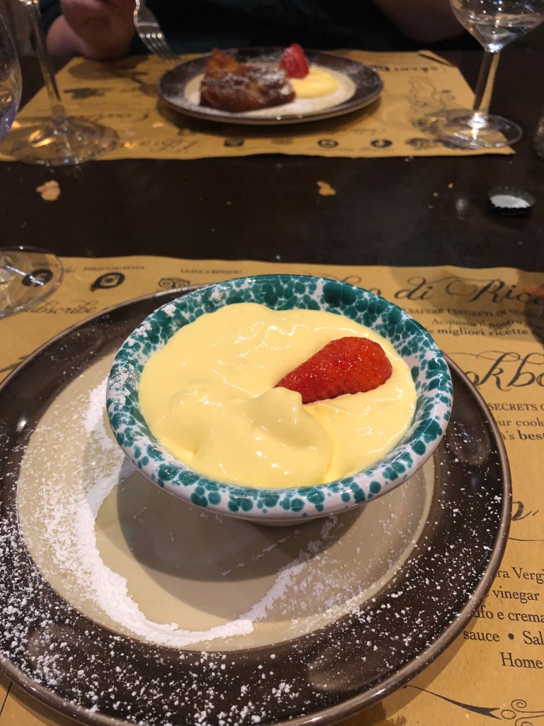 Don’t forget to save room for dessert to sample the Zuppa Luchese, with a base of the buccellato di Lucca (the local sweet bread) topped with cream, strawberries and amazing vin santo. You will be sure to have a more “Italian dinner time” after such a large meal for lunch to carry you through the afternoon.