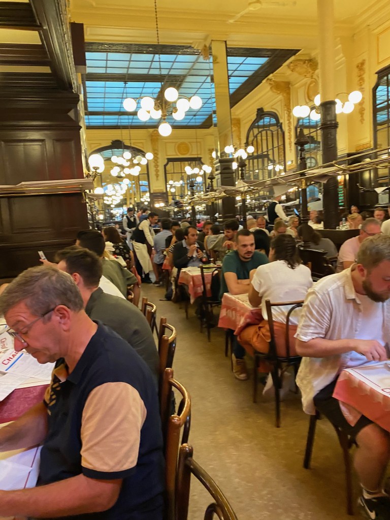 One of the classic experiences you need to have when you are in Paris is a visit to a “bouillon”, a restaurant once frequented by busy workers who didn’t have much time nor money to spare for meals, but now a favorite quick meal for many kinds of French people. The prices are very low, with some dishes starting at 1 euro! One of the best ones was nearby, so we headed to Bouillon Chartier for this rite of passage with an entrance tucked away seemingly in an alley behind some non-descript storefronts. As soon as we stepped in the door, we were greeted with the noise of one of the largest restaurants we saw on our travels, and we wondered how they could ever manage everything that was happening all throughout the establishment.