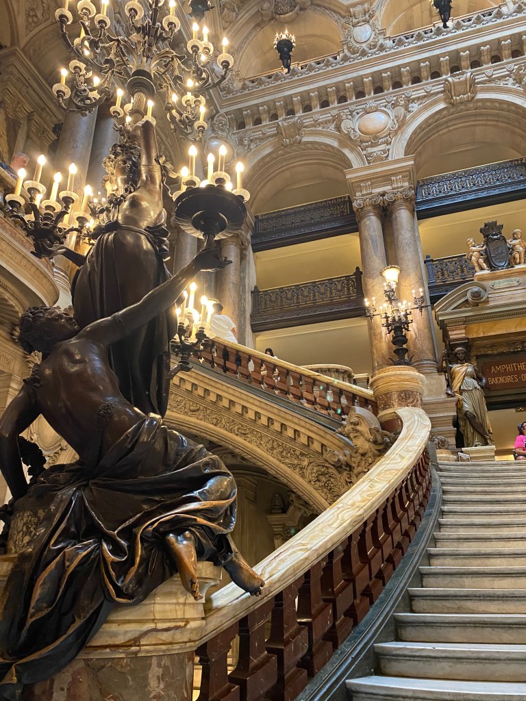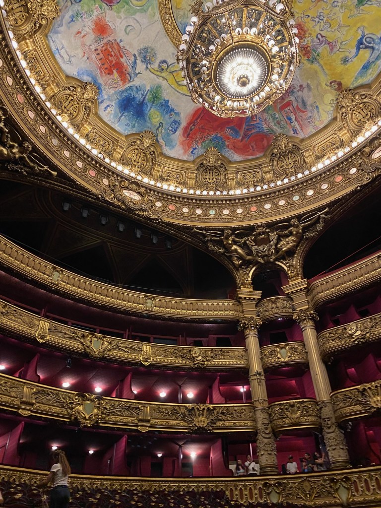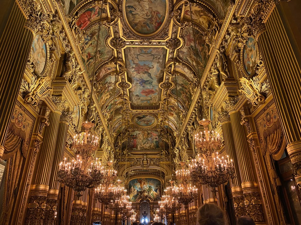Then off to the 9th Arrondissement to tour the grand Palais Garnier, the famed Paris Opera House. As we walked in, my eyes were drawn along the walls up the stairs to the gilded fixtures and the marble all around. As we got to explore the hallways and galleries where the elite went to “see and be seen” in the Belle Epoque era, I was amazed at the décor that rivals the Hall of Mirrors in Versailles.