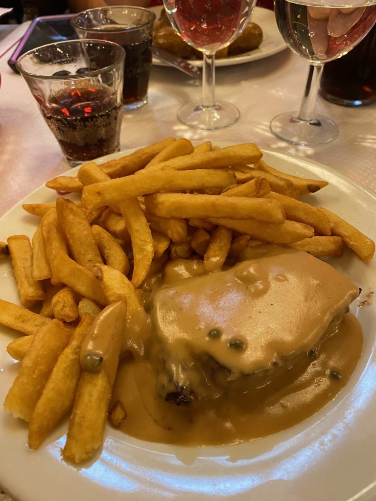 We were quickly greeted and shown to a table that we shared with another couple against a low wall with another table practically joined with ours on the other side. As soon as we sat down, a waiter came over and took our order (I accidentally ordered a carafe of water in Italian!). Within 3 minutes at the MOST, our food arrived (but not our water, so I asked to share the carafe of the French couple sitting next to us, in French!) and we dug in. I HAD to get the steak frites in such a classic place and it did NOT disappoint. I even remembered how to ask for “medium rare” instead of “well done” (which was my steak frites sandwich failure)!