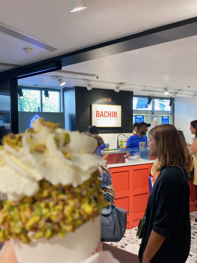We admired the gift shop offerings and went outside to explore the EXPANSIVE Galeries Lafayette, and I used my “Ice Cream Radar”, (Casey coined the term and I agree with it) my ability to be able to find all the ice cream within my immediate area, and spotted people walking out of the Galeries Lafayette Food Hall with GIGANTIC MOUNDS of ice cream covered in crushed pistachios and topped with a generous helping of whipped cream from the Lebanese ice cream shop Bachir, and I knew I had to taste one, no matter how close it was to dinnertime. It was everything I hoped it would be, with the traditional Lebanese flavors perfectly complimented by the nuts and cream. It was so big it almost felt like dinner!