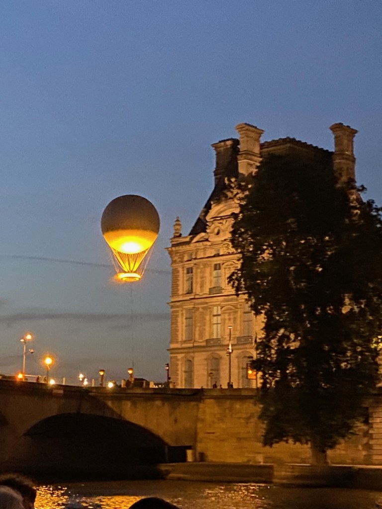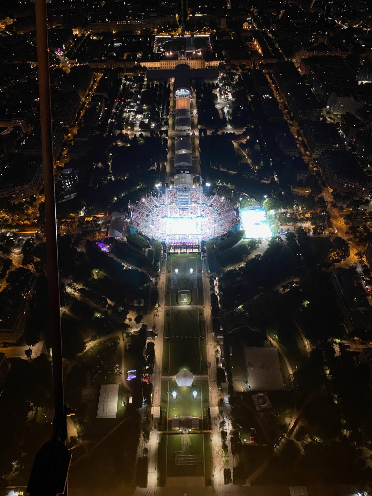 After some confusion about lines, we made it up to the top to view the Olympic city and the revelry on the ground from 906 feet above the Eiffel Tower Stadium. Our views of the parties and events below that we could see from our spot left me with ATMS (Afraid to Miss Something) syndrome from the beach volleyball match we could hear being contested on the ground below us.