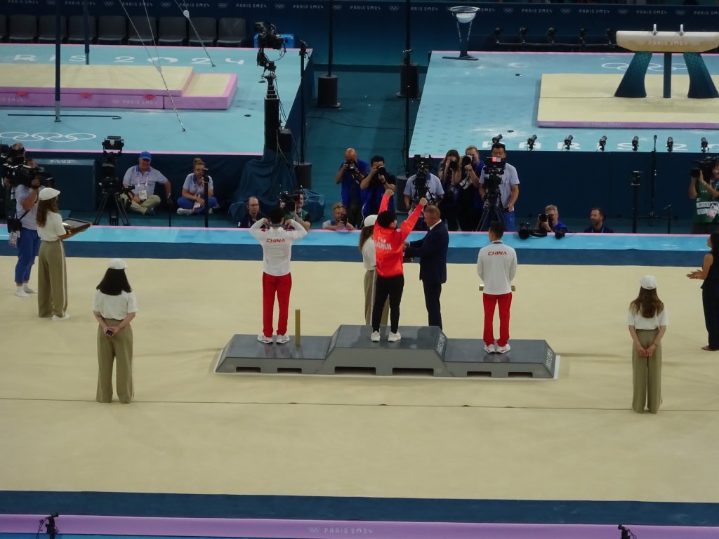 Seeing 6 events all happening at once was even more exciting than the 4 we saw for women’s gymnastics, especially since it was the top gymnasts in the world performing seemingly unreal feats of strength, agility, and athleticism. The showdown between Japan’s Shinnosuke Oka and the 2 gymnasts from China Zhang Boheng and Xiao Ruoteng was down to the wire when the top gymnasts’ last rotation was right in front of us on the horizontal bar. Each release move had the whole arena holding their breath until the men grabbed the bar again in their awe-inspiring routines. The medalists were truly glad for one another when the final scores were announced.