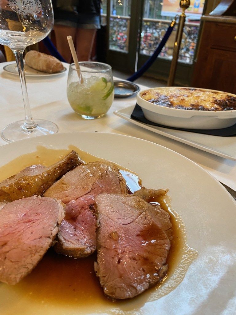 With some wandering around to find souvenirs and especially a box to ship my Tour de France umbrella home in, we made it back to the apartment to prepare for another one of our fancier meals, at the opulent le Train Bleu located in Gare du Lyon.