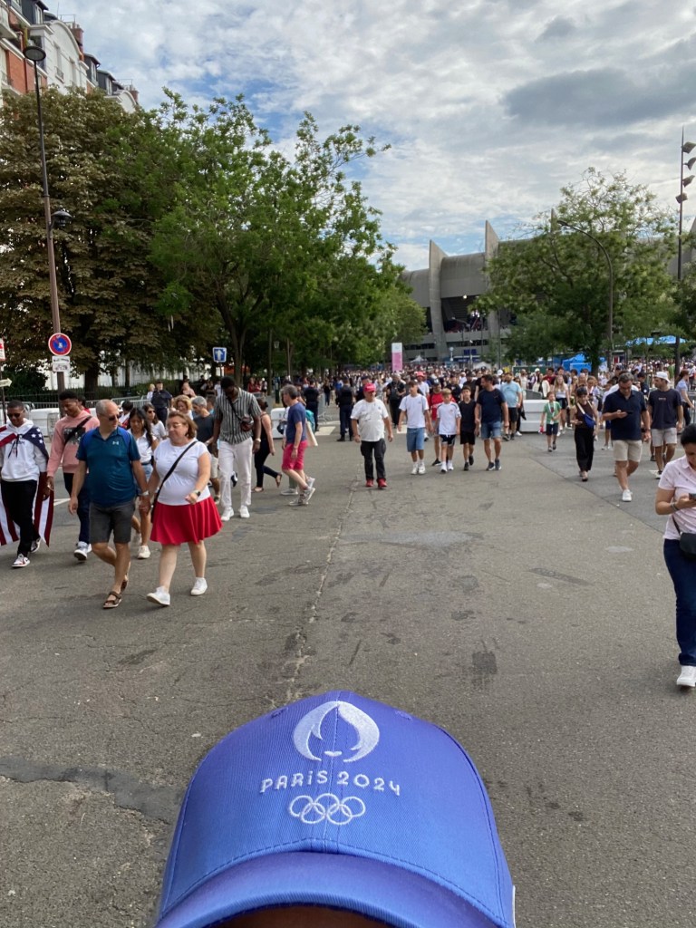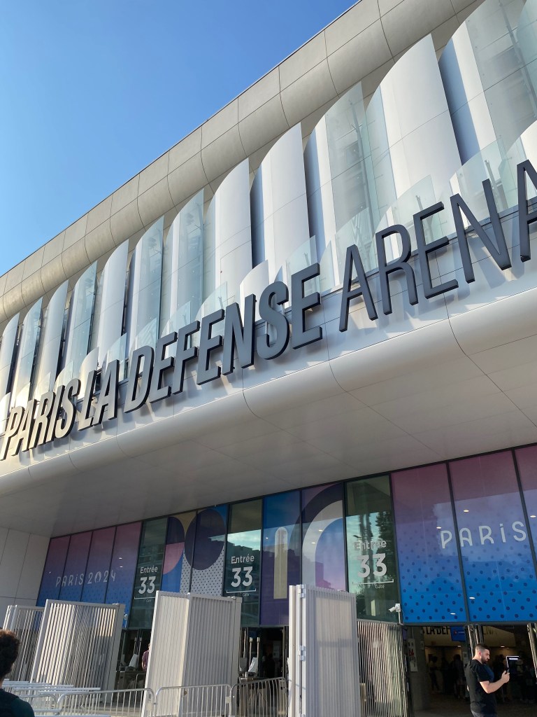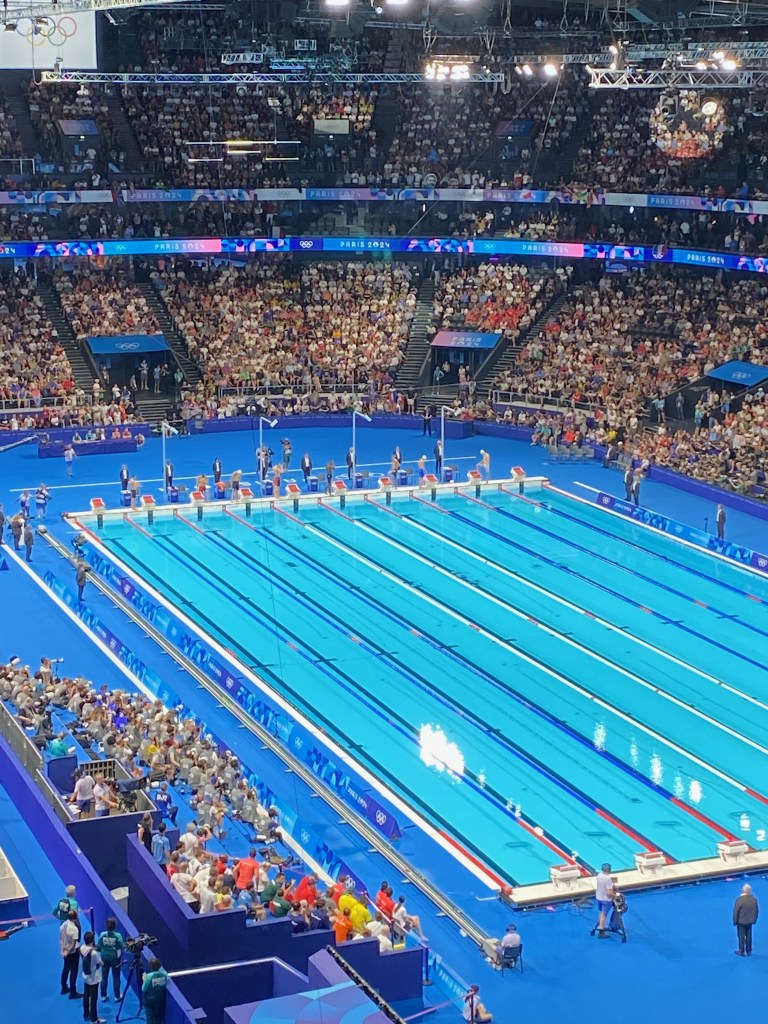 We unfortunately had to leave to get across town to make it to La Defense Arena which we knew would be MOBBED for one of Frenchman Leon Marchand’s most anticipated races, the 200m IM. We tried our hardest to get there early, but with almost a whole line of Metro stations closed, a 15-minute walk to find an open one, and an RER not running according to schedule, we made it past security with only about 30-40 minutes before the session start time.