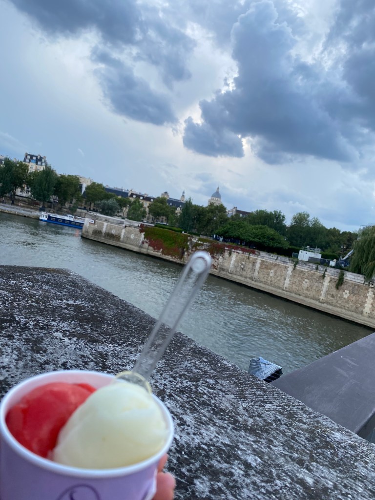 We had walked across the bridge from our Ile de St. Louis to Ile de la Cite to get to our preferred Metro and RER stations frequently and had passed two classic sidewalk restaurants multiple times a day, and with no dinner plans, we decided that tonight was the perfect night to enjoy one of these probably touristy but so familiar restaurants. We started outside, but soon after we sat down it started raining (rain kept interrupting our fun!) and we moved inside to have a nice and light last meal. One last walk down the island before our flight out the next morning!