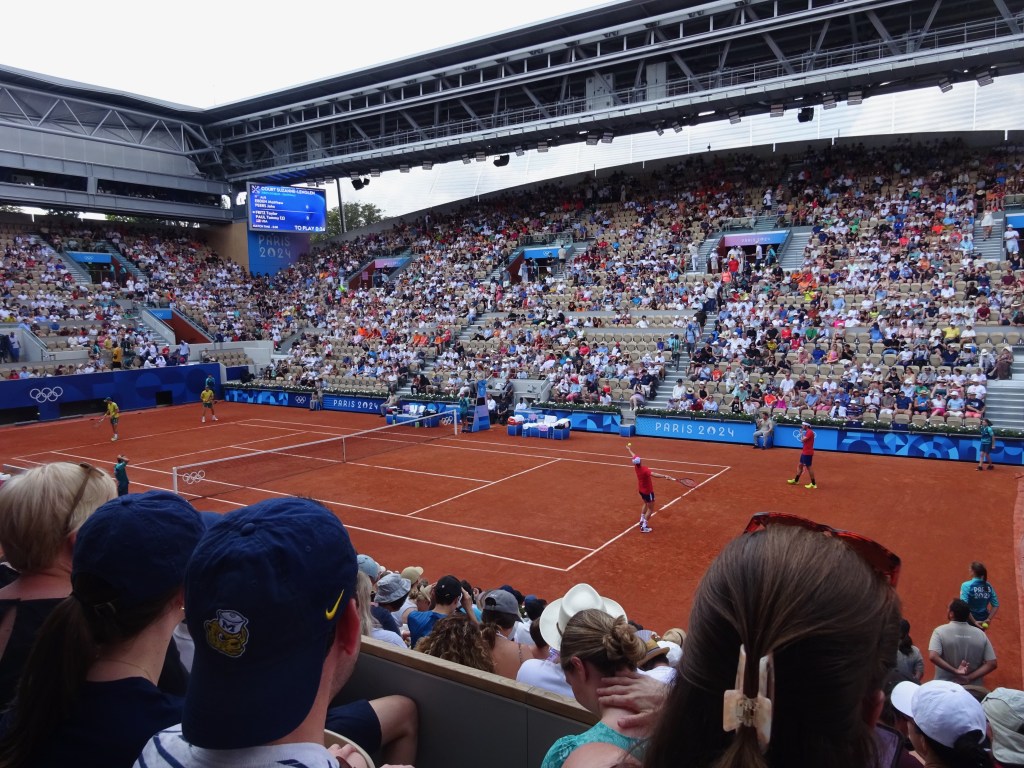 Today was our “big ticket day” with multiple doubles tennis matches in the afternoon as well as swimming finals at night! We made our way to the impressive Roland Garros complex with the biggest venue shop we had seen with many interesting things to purchase!