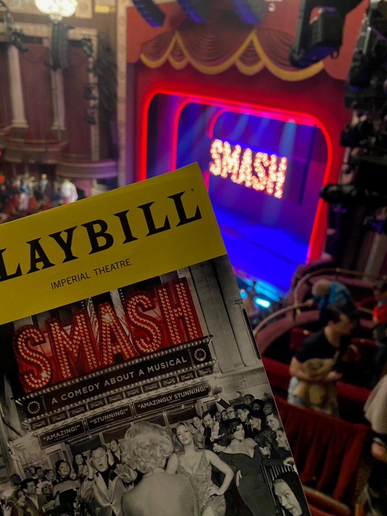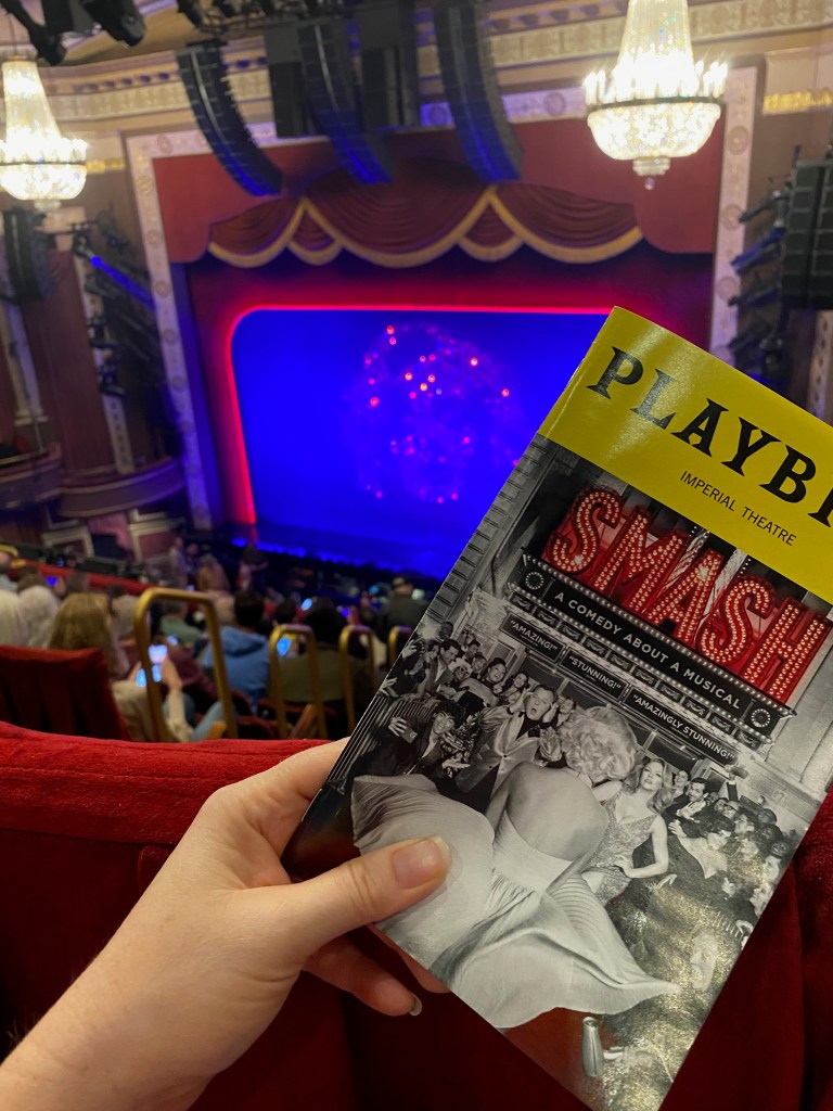 My matinee show was Smash, the musical about the making of a musical, based on the NBC show of the same name from years ago. It was the last show I purchased this time, as I wasn’t sure I would be satisfied with a show that even the creators had said was “similar” to the tv show, but not the same, when I loved the tv show so much. I loved how they incorporated the big belting numbers from the tv show into a new story about the making of a musical about Marilyn Monroe. This was the first show I waited at the stage door for (usually I don’t miss one), but as George Clooney would have drawn an enormous crowd and I most likely wouldn’t have gotten to meet him, the actor’s post show talk at Pirates precluded a stage door meeting, and Jonathan Groff already had legions of rabid fans awaiting his exit after Just in Time, I was ok with the more subdued, NORMAL crowd at Smash where I got to thank the actors for their performances and to share my enjoyment of their show. I was able to speak with a few of them and got my only signed playbill of the weekend.